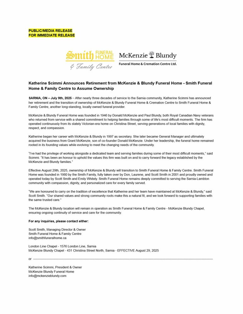 Katherine Scimmi Announces Retirement from McKenzie & Blundy Funeral Home - Smith Funeral Home & Family Centre to Assume Ownership